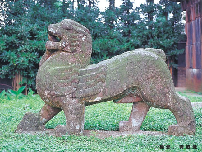 石獸和戰(zhàn)國(guó)時(shí)的青銅翼獸有繼承的關(guān)系,形狀上多似龍虎又如獅,全身從頭到尾仍有那起伏流轉(zhuǎn)的強(qiáng)健線條。漢代從西域傳入的獅子因?yàn)槠溆旅投蔀榧橹F,受到歡迎,石雕自然要和龍虎結(jié)合為一了。當(dāng)然,也有造型較明顯的石獅子。