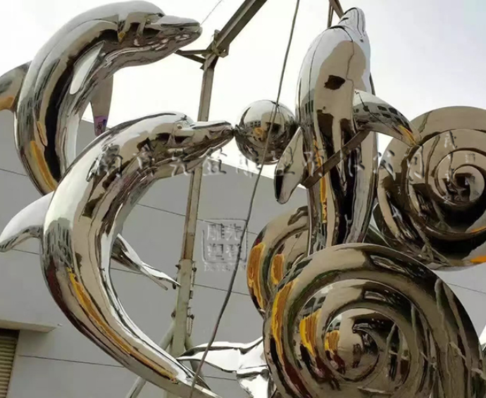 在不銹鋼雕塑制作中主要通過亞光和鏡面兩種肌理效果體現(xiàn)不銹鋼的材質(zhì)美。通常情況下,大面積表面多用亞光效果,而局部重點(diǎn)或管材部分用鏡面效果;主體用亞光效果,球體用鏡面效果對(duì)比好,這也是城市雕塑常應(yīng)用的一種處理手法。