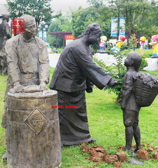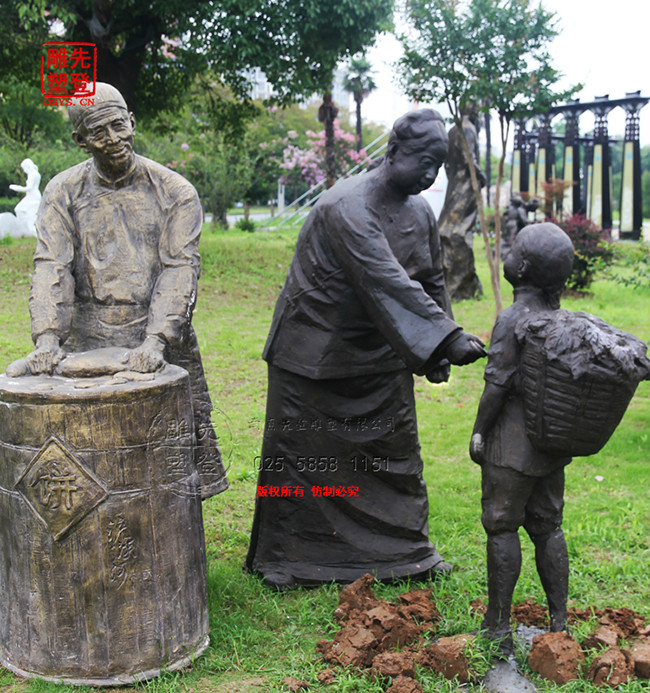 雕塑寓意:老街上賣燒餅的老夫妻已經(jīng)在這里擺攤賣餅許多年了,這些年一直都是價(jià)廉物美。遇見無錢買餅的小孩就送他一塊。
